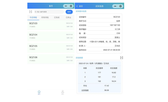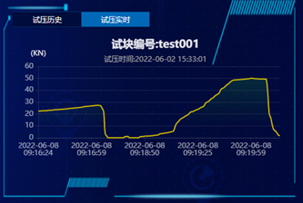 数据采集控制单元联动压力试验机及试块RFID身份信息,进行数据整合,并发送至数据管理平台,进行试块的压力数据、成组试块平均值和养护周期历史曲线等数据的计算及展示。