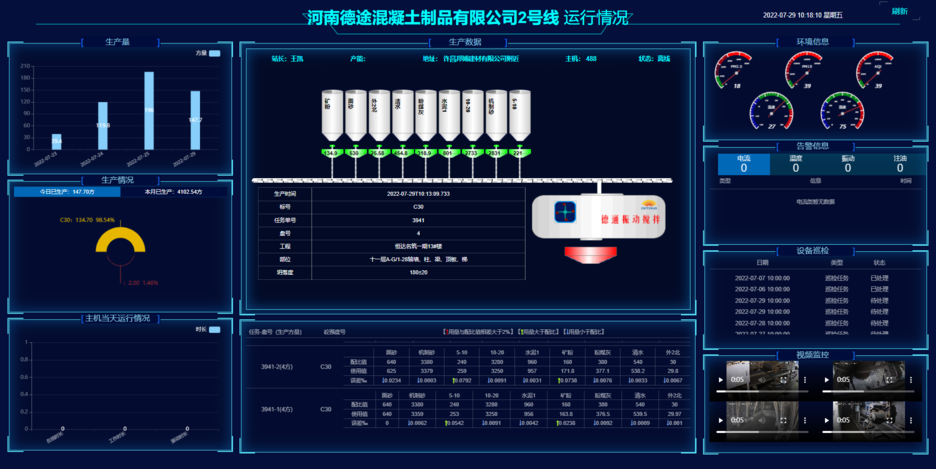 混凝土质量监管平台包含:原材质量监控,确保原材料的质量安全性;混凝土配比及生产质量预警系统,严格监测生产过程中实际值配比值与设计配比的误差比例,保证生产质量,同时可以通过视频数据实时监测混凝土下料质量; 混凝土试验室数据采集及试块压力试验预警系统,为每批次混凝土赋予唯一的流水号(数字身份证),系统支持电子二维码模式,实现工程质量监控;砼车运输过程质量监控及预警系统,可以准确的了解砼车运输过程的各种运行状态,如运行时长、超时停车、正反转异常、电子围栏超限等,确保混凝土运输过程的质量。