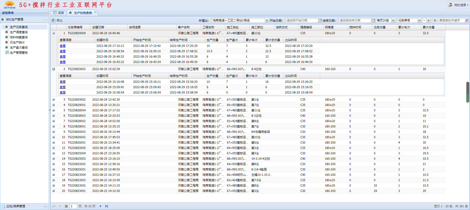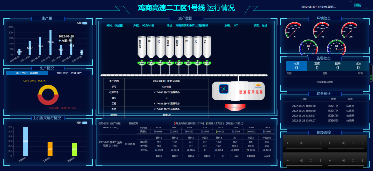 整站数据采集系统将各部门业务逻辑系统化,从原材库存到在线生产及实验室试验分析等一系列数据整合、分析、展示,全面协同生产任务管理、实验室配比等环节,降低沟通成本,提升生产效率。通过综合管理界面,使商砼站管理数字化、直观化,优化管理机制,合理安排调度,提高生产效率。